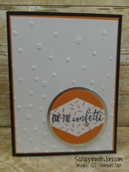 Stamp sentiment with black ink on white paper. Punch out with Tailored Tag punch. Stamp confetti with Pumpkin Pie ink.