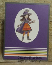 From Toil & Trouble paper, cut strip of stripes - adhere to bottom of Gorgeous Grape paper. I placed mine 1/4" from bottom of paper.