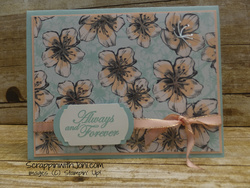 How pretty is this card? I love how the color of the mat and the card base work with this beautiful paper from the Parisian Blossoms paper pack. I am planning on using this for a wedding card. You could change the sentiment and it would be a beautiful birthday card.