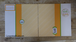 Cut two strips of Mango Melody 2 X 12. Attach 1 strip of Mango Melody next to each stripe paper on Whisper White paper.