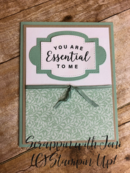Cut 15” of Mint Macaron ribbon attach center of ribbon to card front back, bring to front at place where mint print stops. Tie a knot on card front and trim ribbon to desired length.