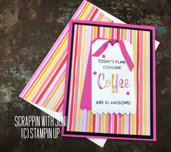 Die cut “coffee” from striped paper. I put an adhesive sheet on the back before die cutting. Remove adhesive backing from the back of Coffee and attach to white tag between stamped sentiments. If you don’t have adhesive sheets, some dots of liquid glue would also work.